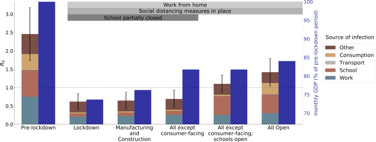 We analyse the economics and epidemiology of different scenarios for a phased restart of the UK economy. Our economic model is designed to address the unique features of the COVID-19 pandemic. Social distancing measures affect both supply and demand, and input-output constraints play a key role in restricting economic output. Standard models for production functions are not adequate to model the short-term effects of lockdown. A survey of industry analysts conducted by IHS Markit allows us to evaluate which inputs for each industry are absolutely necessary for production over a two month period. Our model also includes inventory dynamics and feedback between unemployment and consumption. We demonstrate that economic outcomes are very sensitive to the choice of production function, show how supply constraints cause strong network effects, and find some counter-intuitive effects, such as that reopening only a few industries can actually lower aggregate output. Occupation-specific data and contact surveys allow us to estimate how different industries affect the transmission rate of the disease. We investigate six different re-opening scenarios, presenting our best estimates for the increase in R0 and the increase in GDP. Our results suggest that there is a reasonable compromise that yields a relatively small increase in R0 and delivers a substantial boost in economic output. This corresponds to a situation in which all non-consumer facing industries reopen, schools are open only for workers who need childcare, and everyone who can work from home continues to work from home.